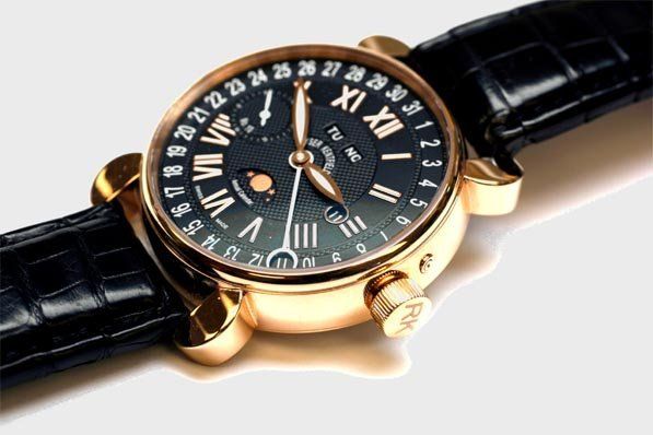 RK S600 Complication Annual Calendar 46mm 18 K Rose Gold Case (only one made / Year ) The annual Calendar The question of always giving the right date was a weak point in calendar movements Because 7 months of the year have 31 days and 4 months have 30 days, February has 28 days for three years and 29 days every four years (leap year). The annual calendar adjusts automatically one or two days ahead, depending of the month with 30 or 31 days. Once a year the annual calendar needs to be adjusted manually, between the end of February and the first of March. In addition, the order of the months with 31 or 30 days is uneven, witch makes it solving the problem even harder. Watch Functions : Number Month Indicator at 3 , and a second Month Indicator (in letter type) and Day (in letter type) at the two Windows at 12 + Pointer-Date and Moon-phase at 6 and small seconds Hand at 9 The Month indicator at 3 or Clock is an additional Month indicator in Numbers 1-12 . (1 for January 2 for February etc... when Number 2 appears in red,it will be February ( this indicator is designed to remind you for the Month of February, in order to make the Annual Yearly Date correction for the following Year a head The RK S600 is also available in a manual Calendar ( you have to adjust the Calendar every Month with the Pushbuttons by Hand for the correct Calendar Function )